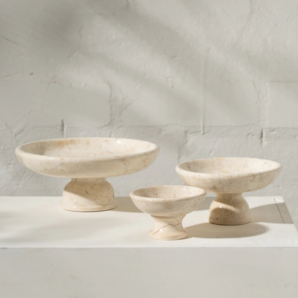 These beautiful podium bowls are made using natural travertine marble. Each item is unique with different colouring and natural patterning. Marble may contain small cracks, holes and pits that are characteristic of this authentic product.