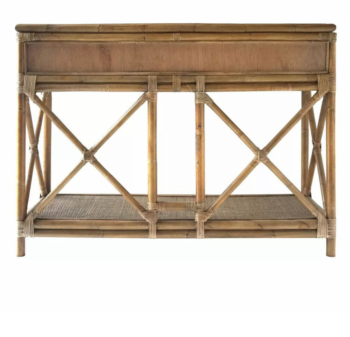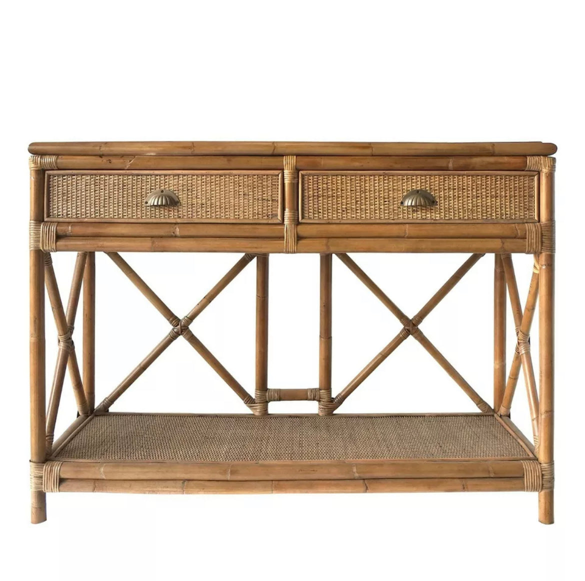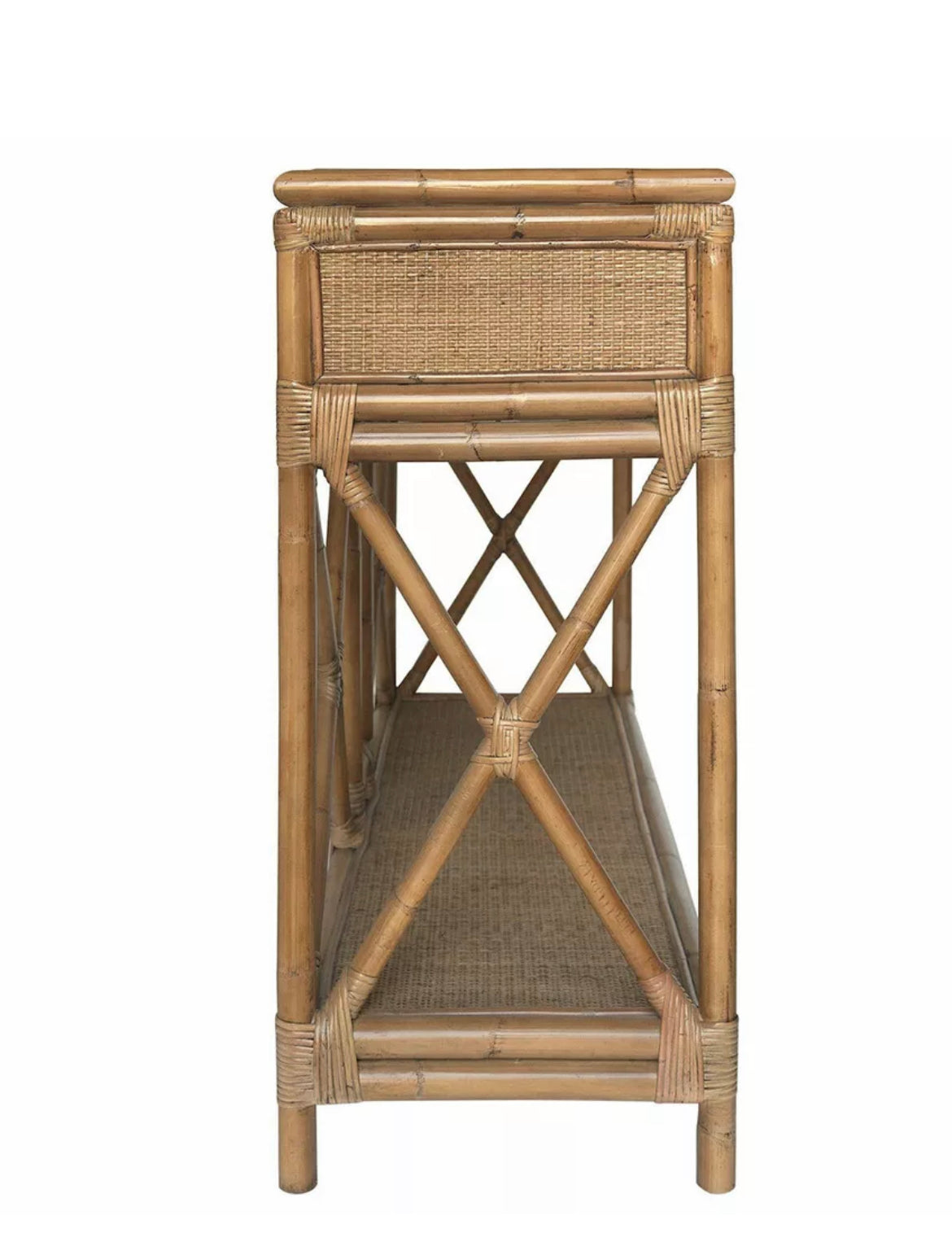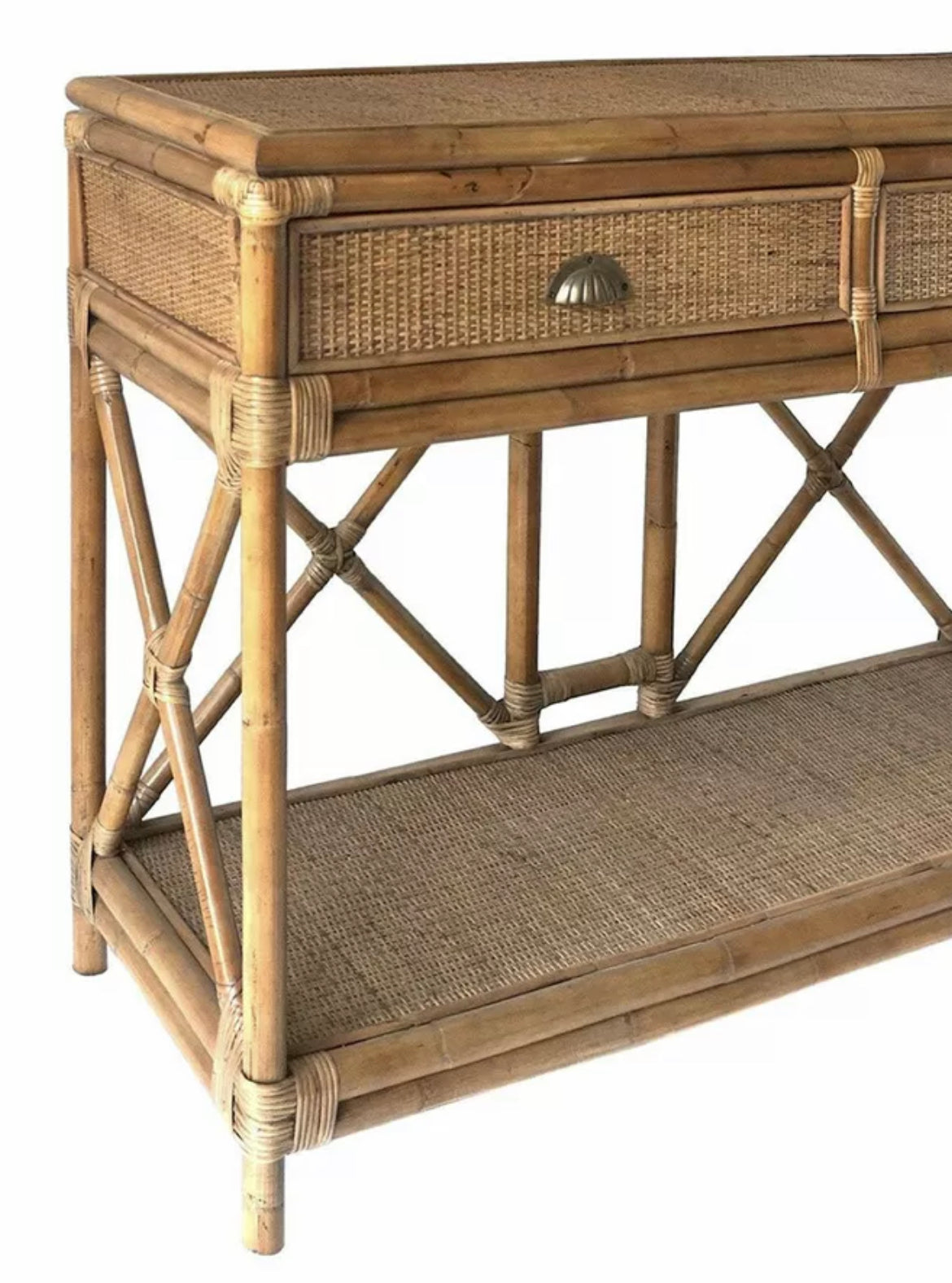 The Small Cayman Rattan Console comprises of double drawers and a low-level display shelf. This gives you ample opportunities to create a styled vignette or tuck away unsightly must-haves. The cross-back detailing adds an elegant touch.