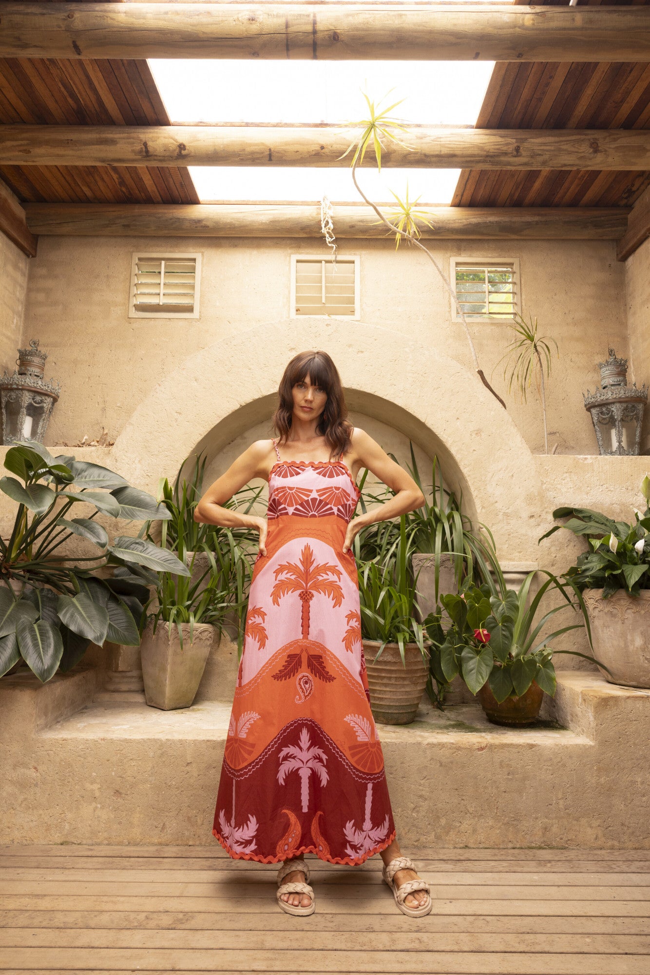 Begin your next chapter with the timeless traveler’s Celeste Orange Strappy Dress. Its flowing silhouette and delicate straps give the dress a playful, airy feel, perfect for sunny days and warm evenings. Whether you're attending a garden party or enjoying a seaside stroll, this dress offers a bold look with its oasis on the Sahara print that is both simple and chic.