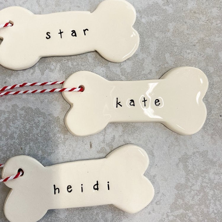 Ceramic Dog Bone Decoration. Gloss finish. Hand write a personalised message on the back (unglazed side) using a felt pen.