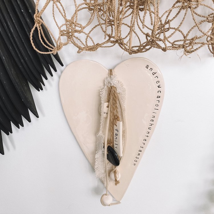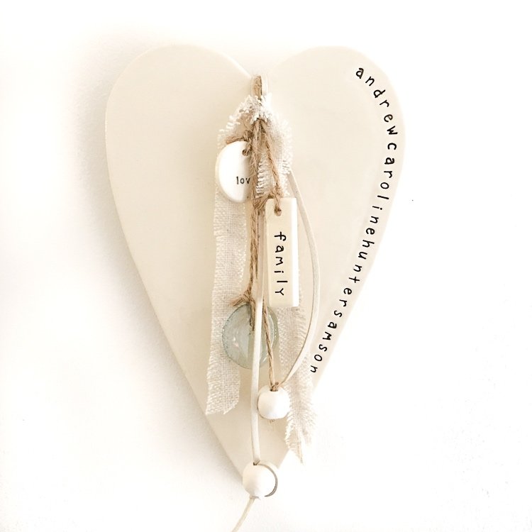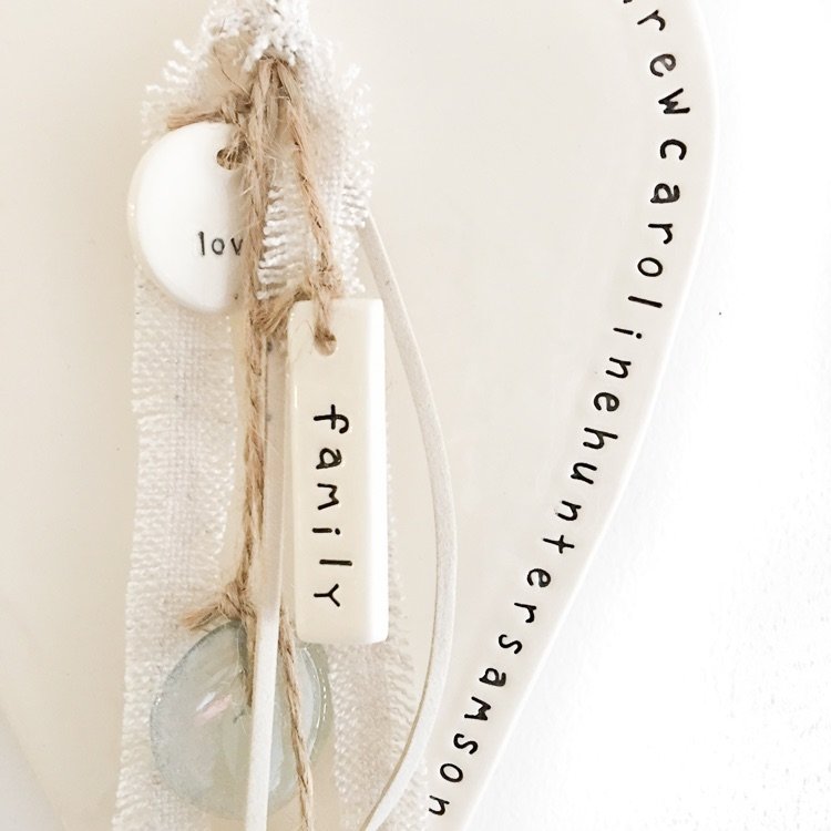 Personalise the rectangle tag with the bride & groom names or simply family. Natural twine | cords & ribbons | hand rolled clay pebble beads | fired glass | mini-tags.
