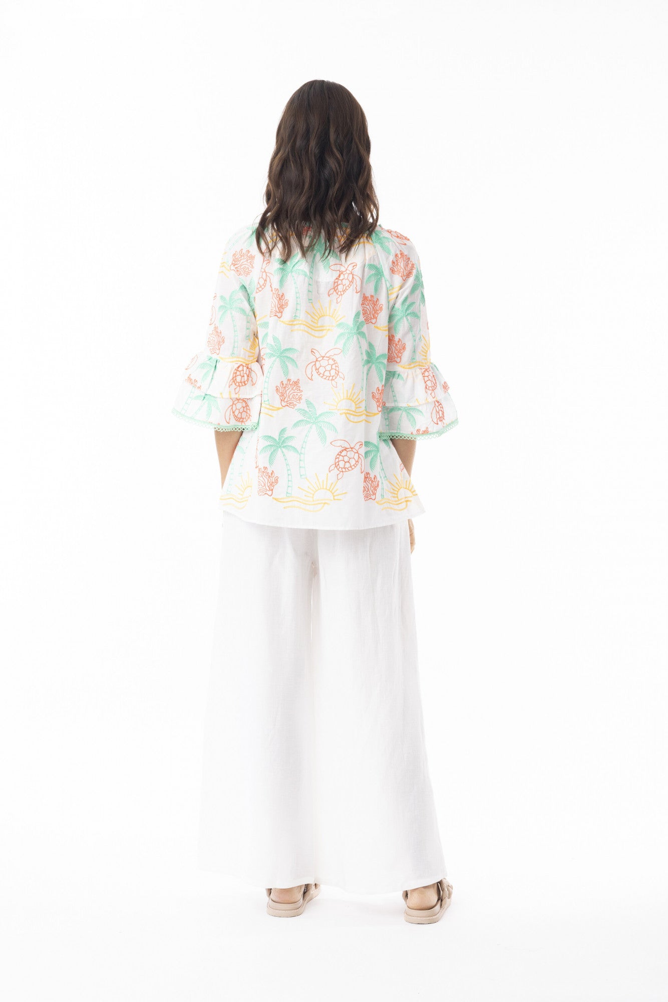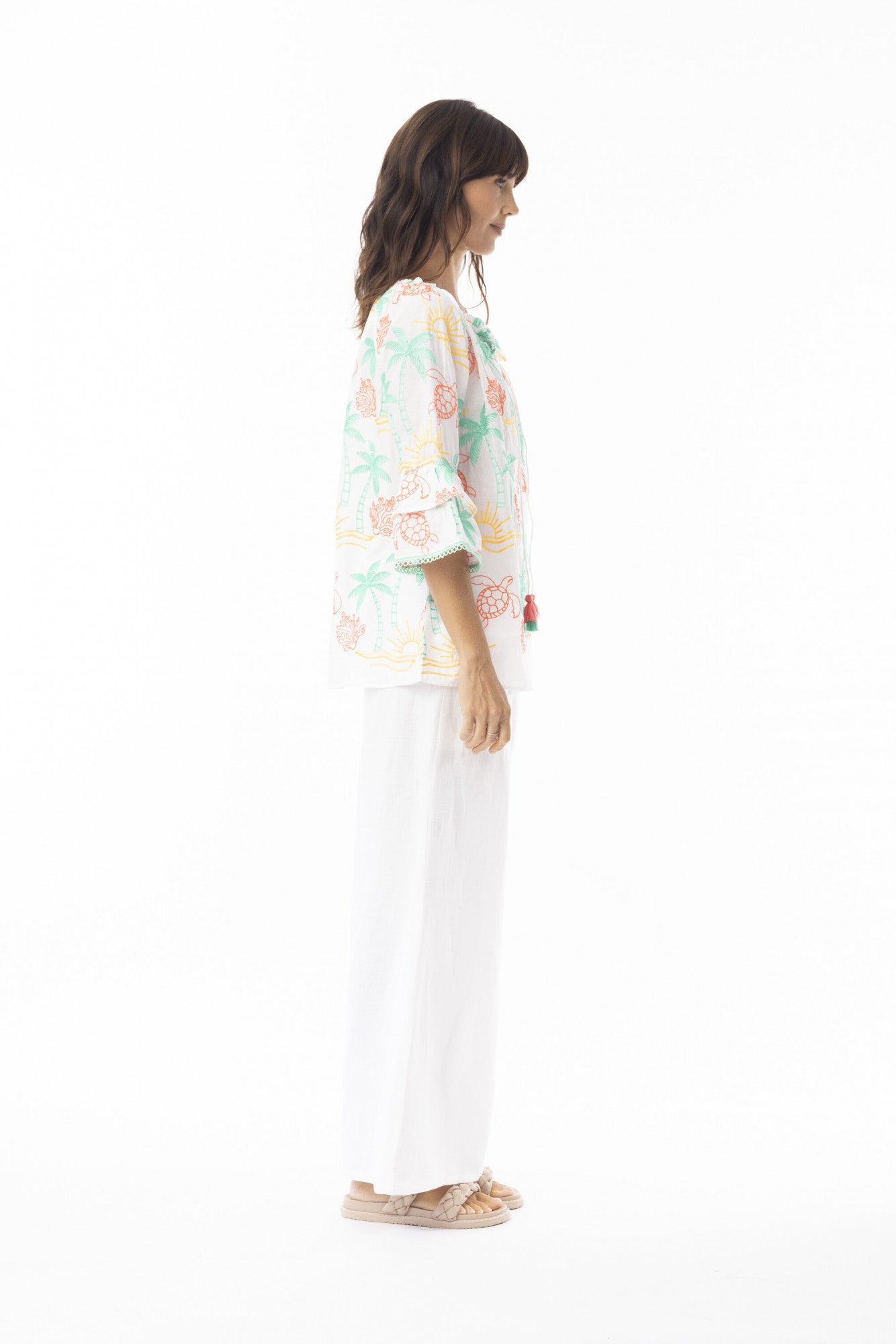 Answer the call of adventure in the twilight-hued Coral Top. Featuring an open neckline with tassel details, three-quarter flared sleeves, bright colours, fun prints, and a relaxed silhouette, this is the perfect top to throw on with a pair of our linen pants at the beach!
