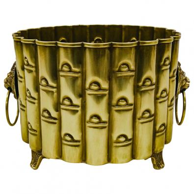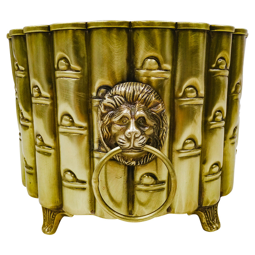 This round brass trinket box features a unique bamboo-look design and lion's head handles. It could also be used as a pot holder