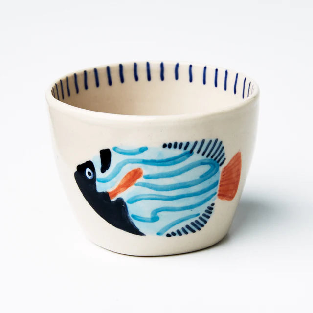 Each line and stroke on this earthenware cup, the Fishy Cup Medium, is hand painted by Jones & Co makers. No two pieces will ever be the same as they are created by artisan hands.