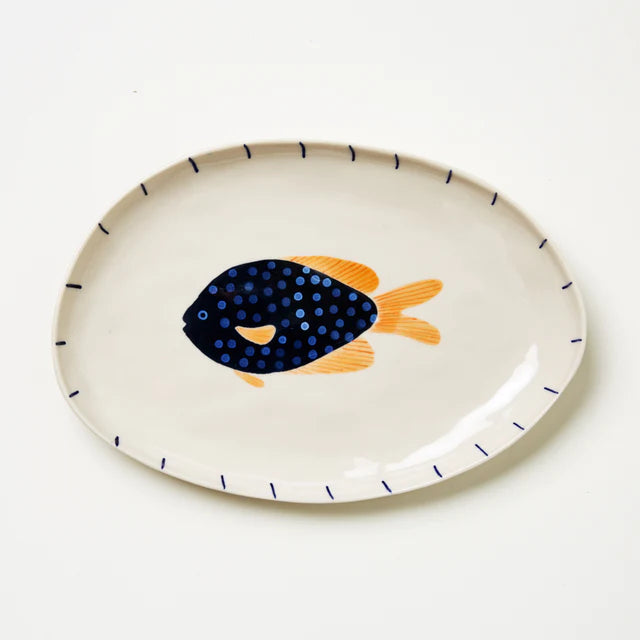 The Fishy Oval Tray by Jones & Co features a hand-painted spotted fish in the centre of this oval-shaped earthenware dish. Use it as a wall art display or as a catchall tray to corral items on your dressing table.