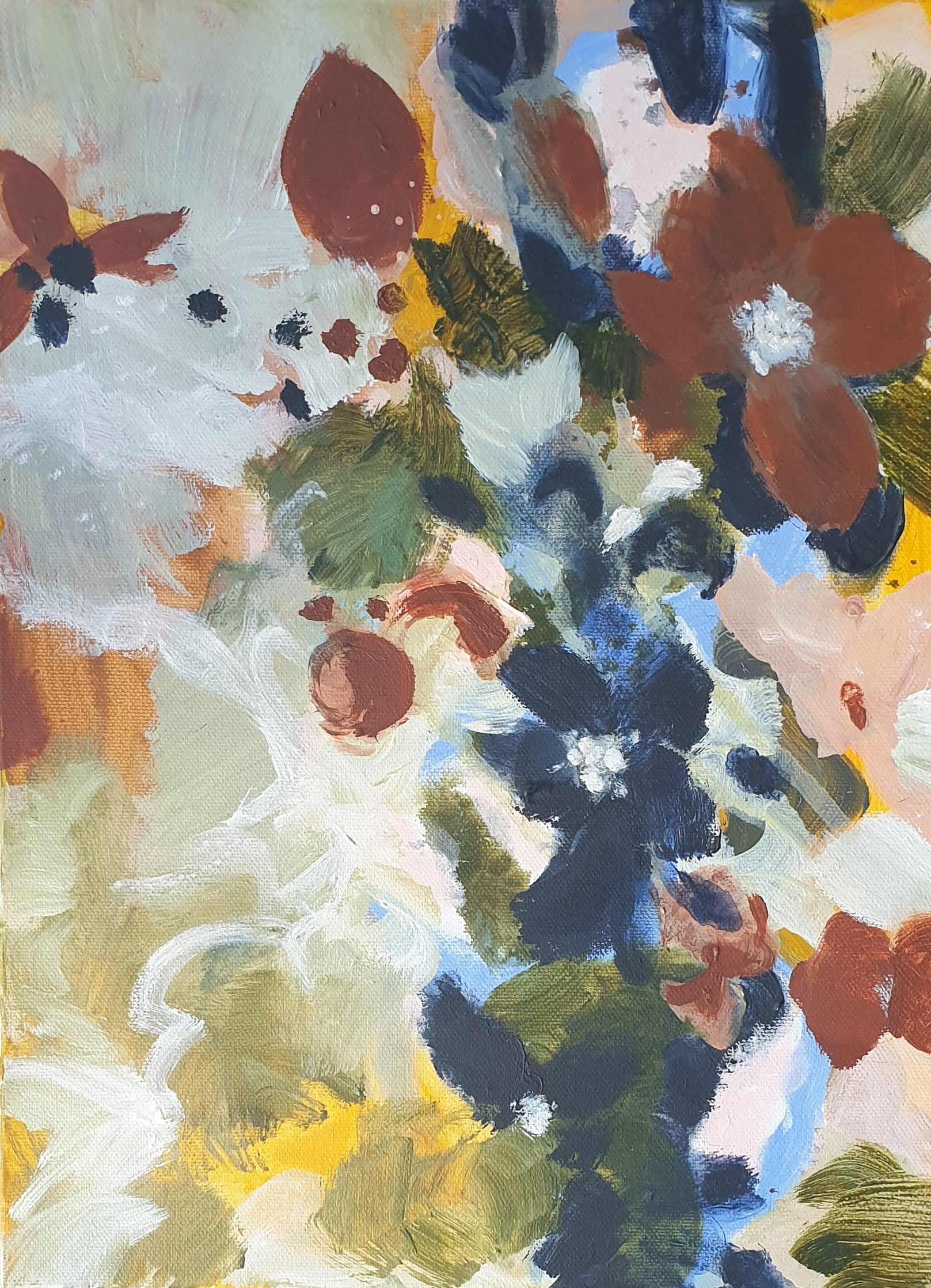 This series of three abstract paintings explores the organic motion of climbing flowers through an intuitive process of layering and contrast. Using a palette of earthy brown, deep grey, white, yellow, pink, and subtle hints of sky blue, I became intrigued by how these colours interacted. The dark brown against the grey became a focal tension, while the flowers’ upward movement hints at persistence and quiet strength. Painted without a predetermined plan, these works grew naturally, much like the forms they represent.