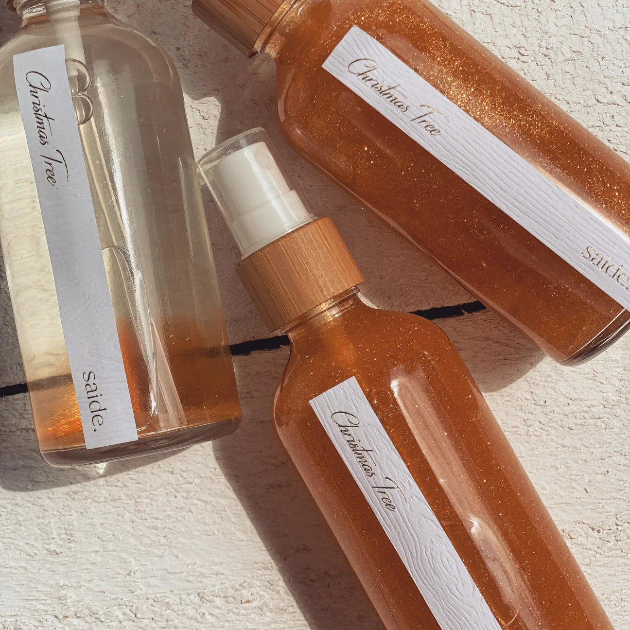 It's beginning to look a lot like Christmas, with our luxe glitter Christmas Tree Fragrance Spray! Simple, yet glam with gold glitter dust, give it a shake and watch the enchanting swirl it creates. Sprits on your Christmas tree (perfect if you don't have a real one!) or in your space and let the fragrance of pine tree fill the room for hours in true Christmas spirit. Merry Christmas!