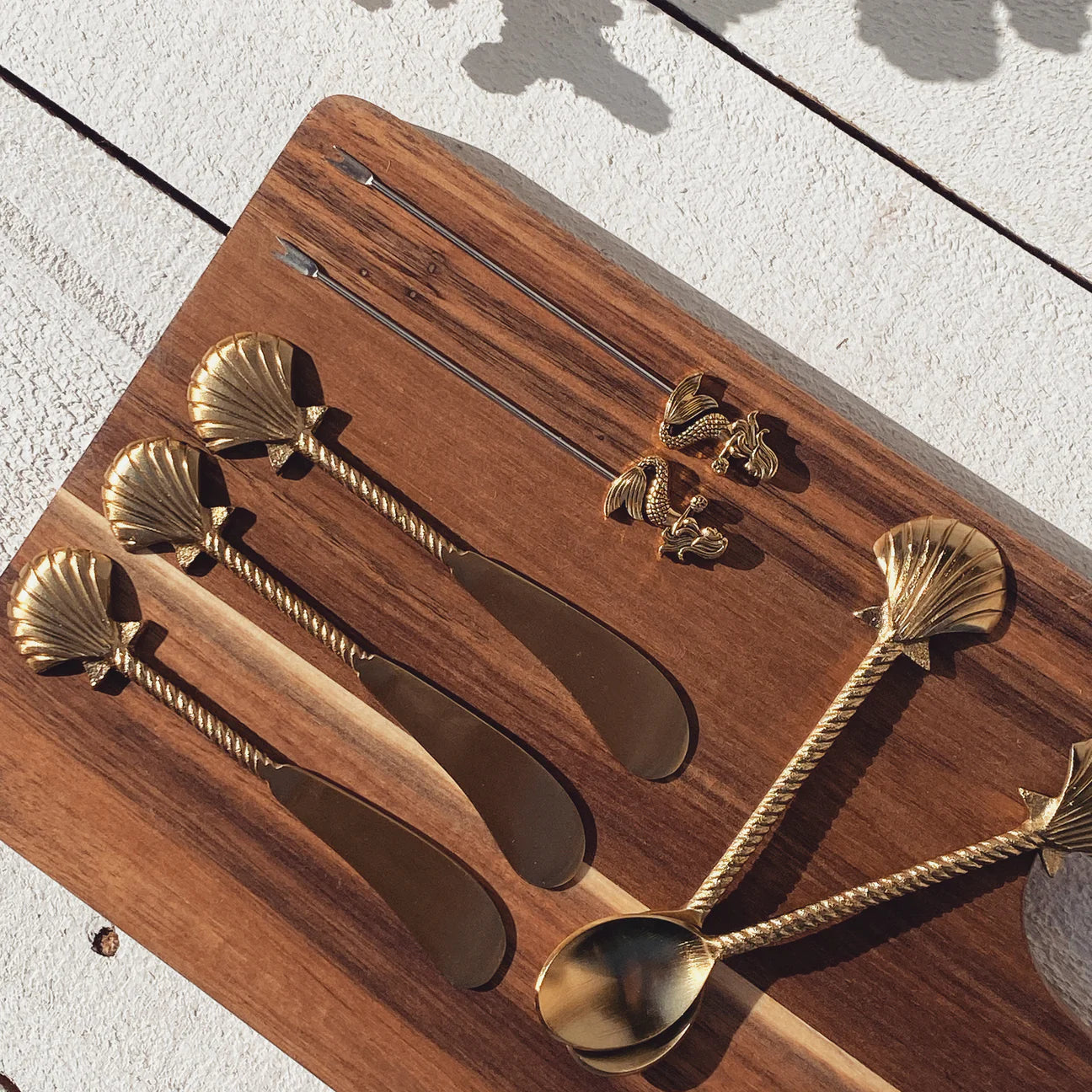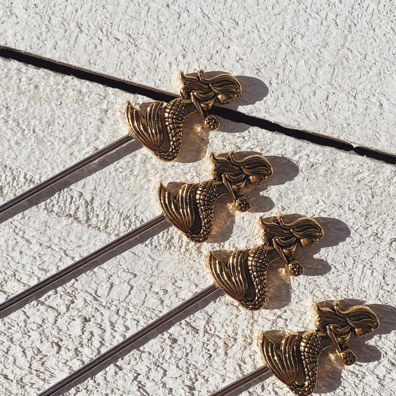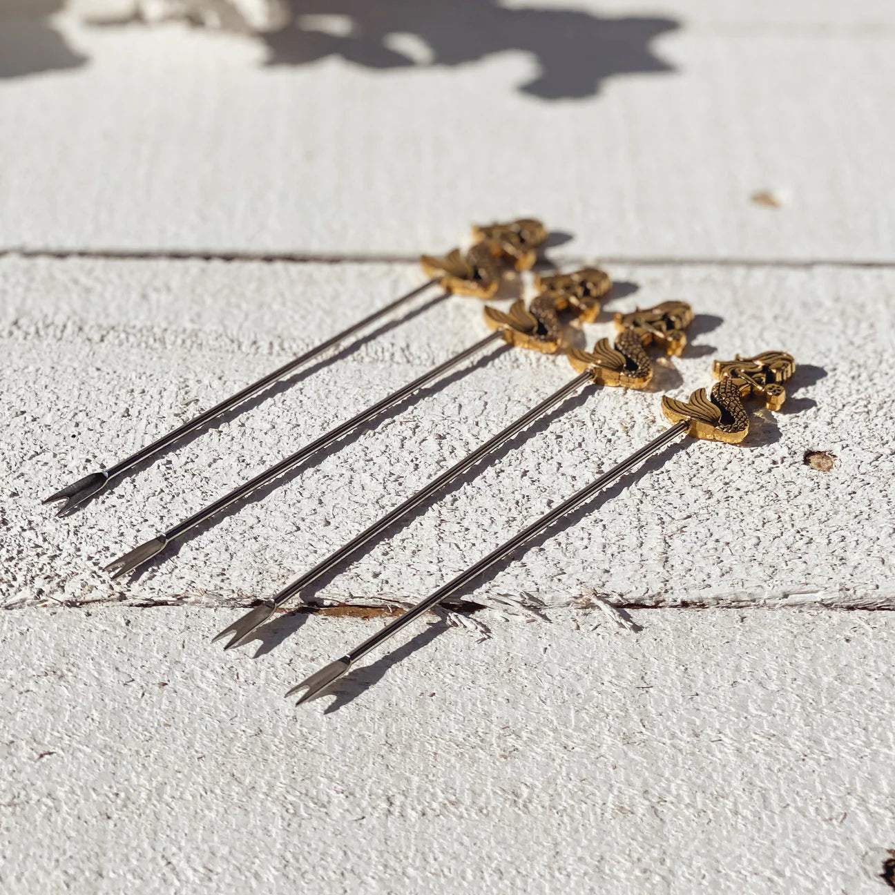 Embrace a coastal vibe with this cute Mermaid Cocktail Pick Set, ideal for stylish home entertaining. Perfect for serving your cocktails with a garnish, cheese platter condiments or simply styling on your bar cart. Hand crafted India from stainless steel and brass, it features a detailed mermaid with a gold and silver finish.