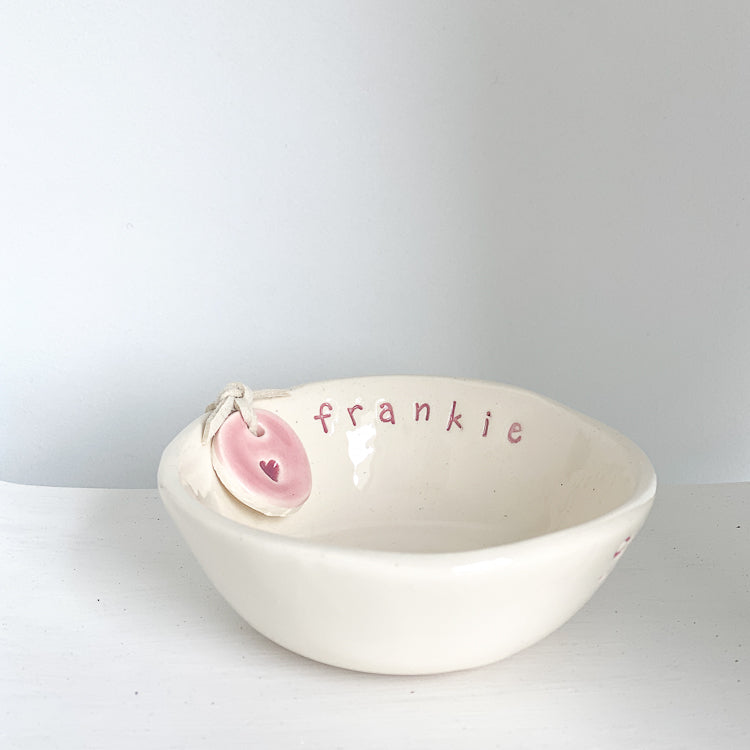 Handmade Personalised Ceramic Little Bowl with Name and Pink Tag