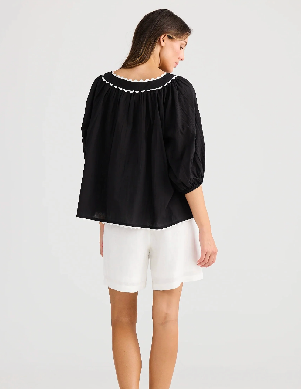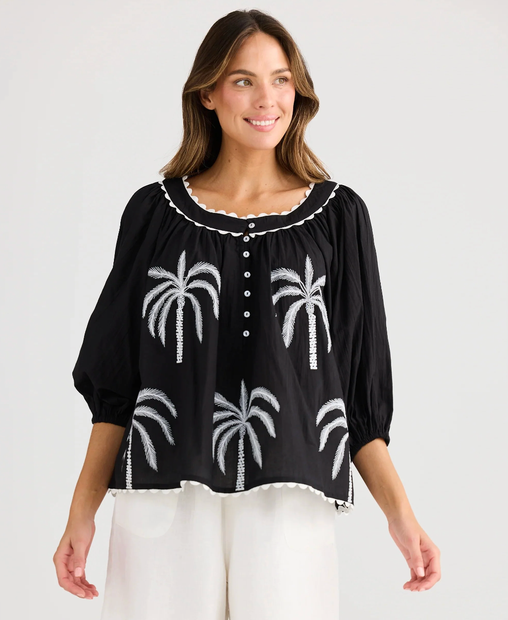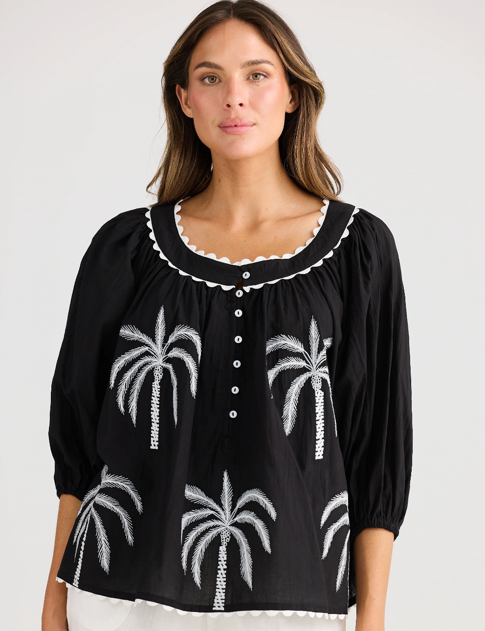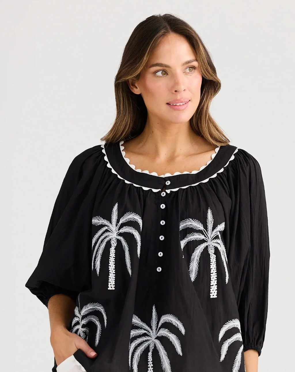 The Jumeirah Maxi Dress in black features white embroidery and a front neckline split secured with a button loop closure. It offers mid-length raglan sleeves with elasticated hems and a relaxed midi-length fit. Detailed with contrast palm embroidery, scalloped trim, inseam pockets, and a removable waist tie, this dress combines comfort with refined style.