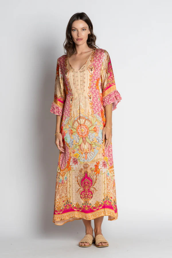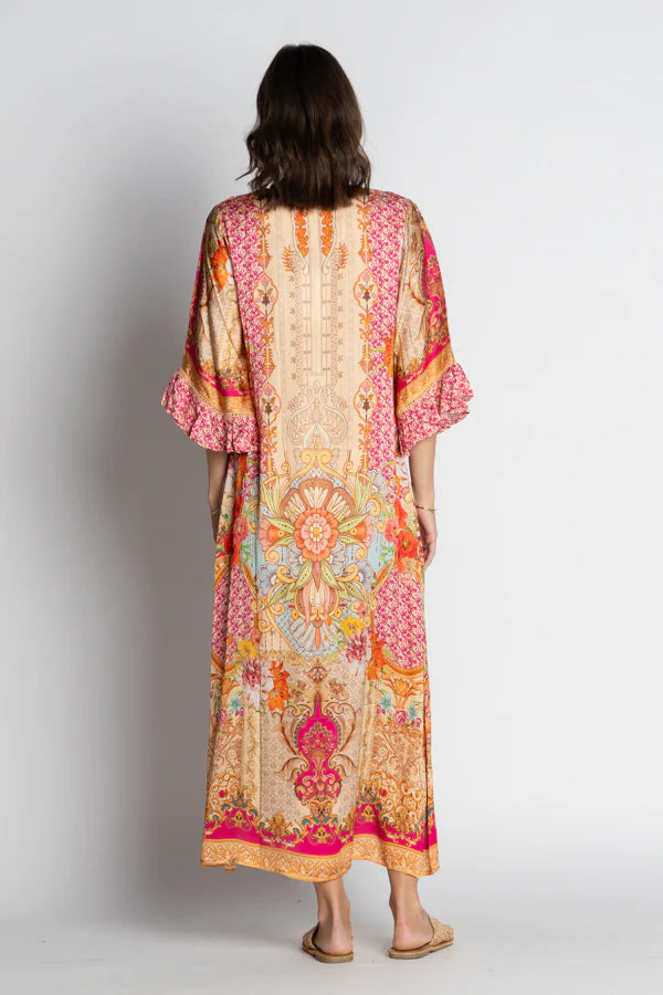 Wide elbow-length sleeves are finished with ladder lace and ruffle hems for delicate detail. Digitally printed in vibrant patterns and designed in Australia, this versatile dress is perfect for casual outings, resort wear, or elegant summer events.