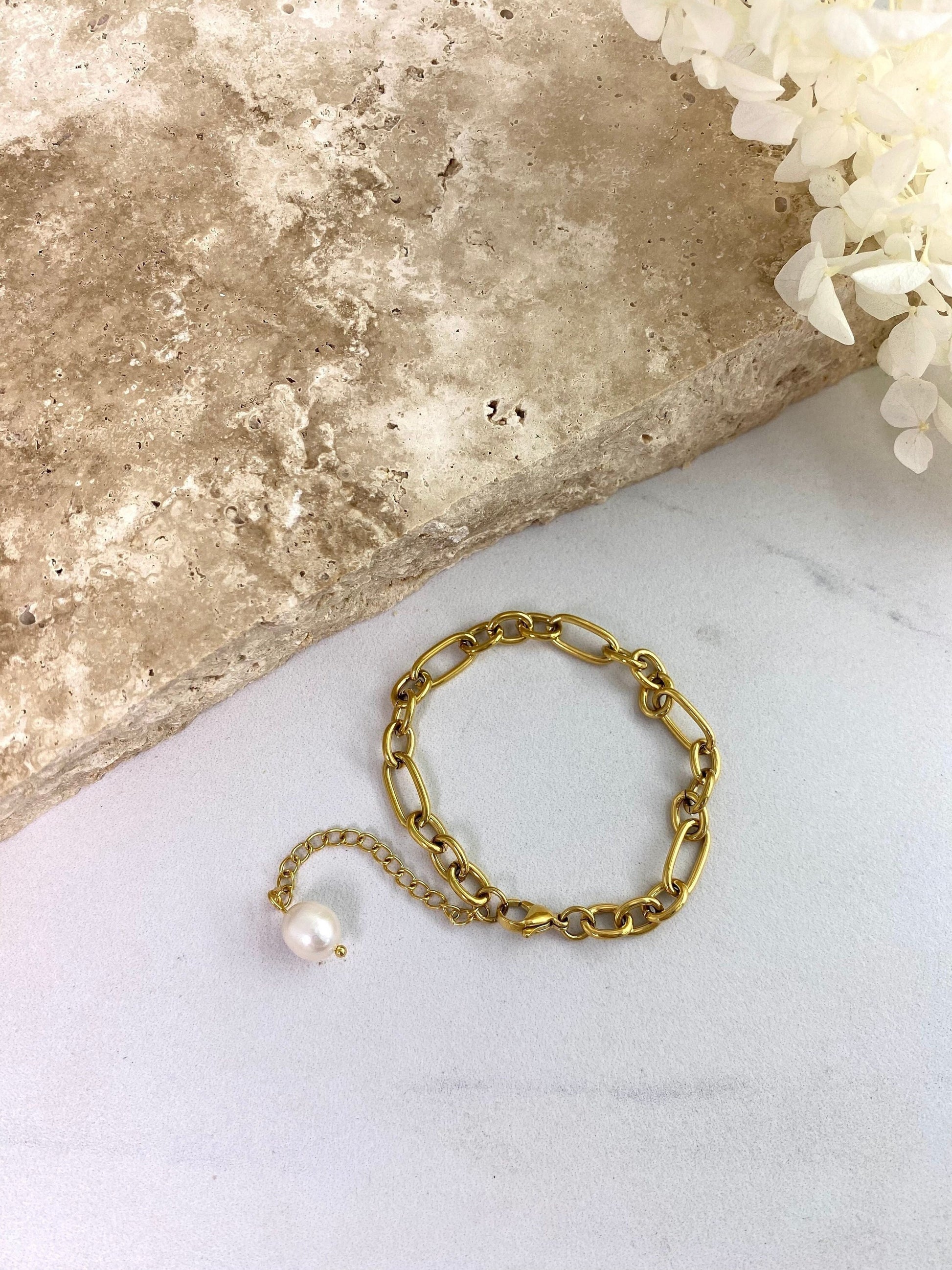 Gorgeous gold chain bracelet with natural pearl charm made of 18K gold plating, making a simple but elegant statement.