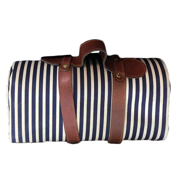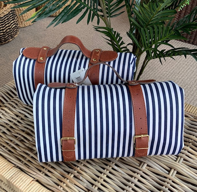 Navy & White Stripe Cotton Picnic Blanket with Waterproof Underside and Dark Brown Carry Strap.Min. Order 2 Units. Open blanket size: 130 x 150cm