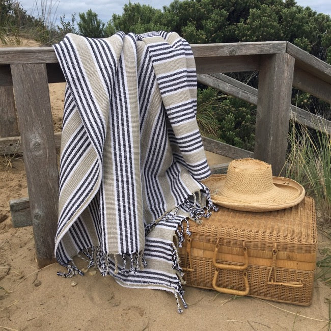 Just as restrictions are eased, Carnival Homewares lands its favourite Picnic Rugs!  Hand woven soft cotton in a mix of earthy naturals, garden greens and coastal blues.  Add casual style to outdoor entertaining with 5 classic striped designs! A  perfect ground cover for any picnic, or table, and a handy accessory to keep in the car.  A versatile rug in a thick slubby weave with hand-knotted fringes on 2 ends.  Exclusive to Carnival Homewares.