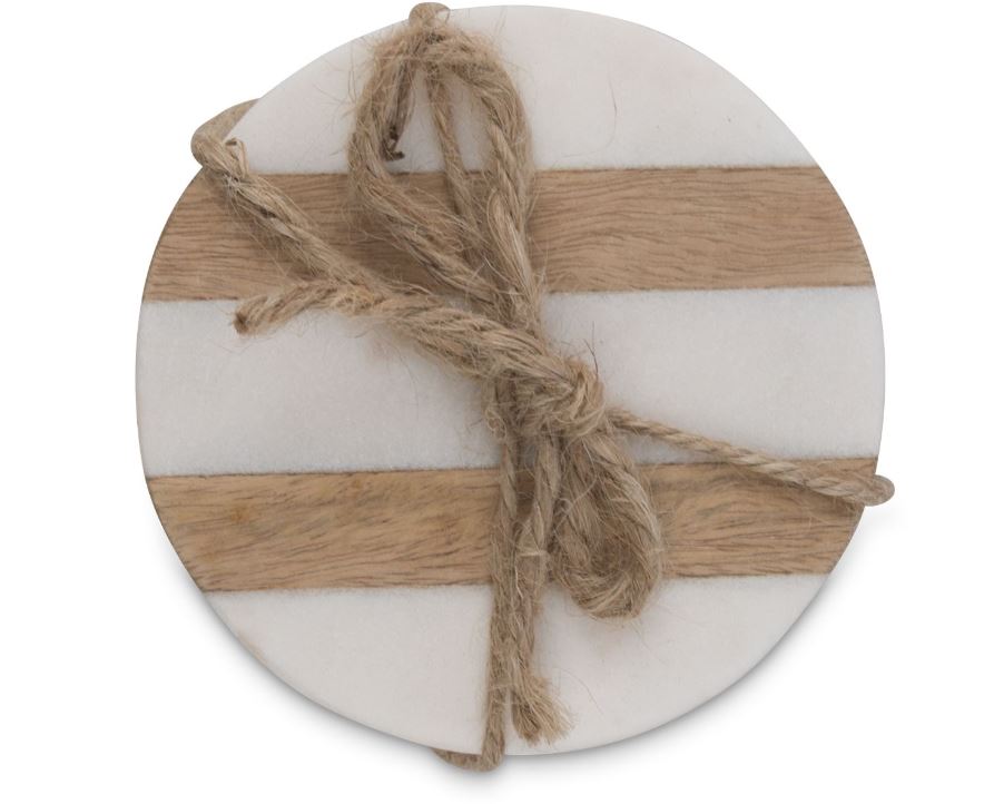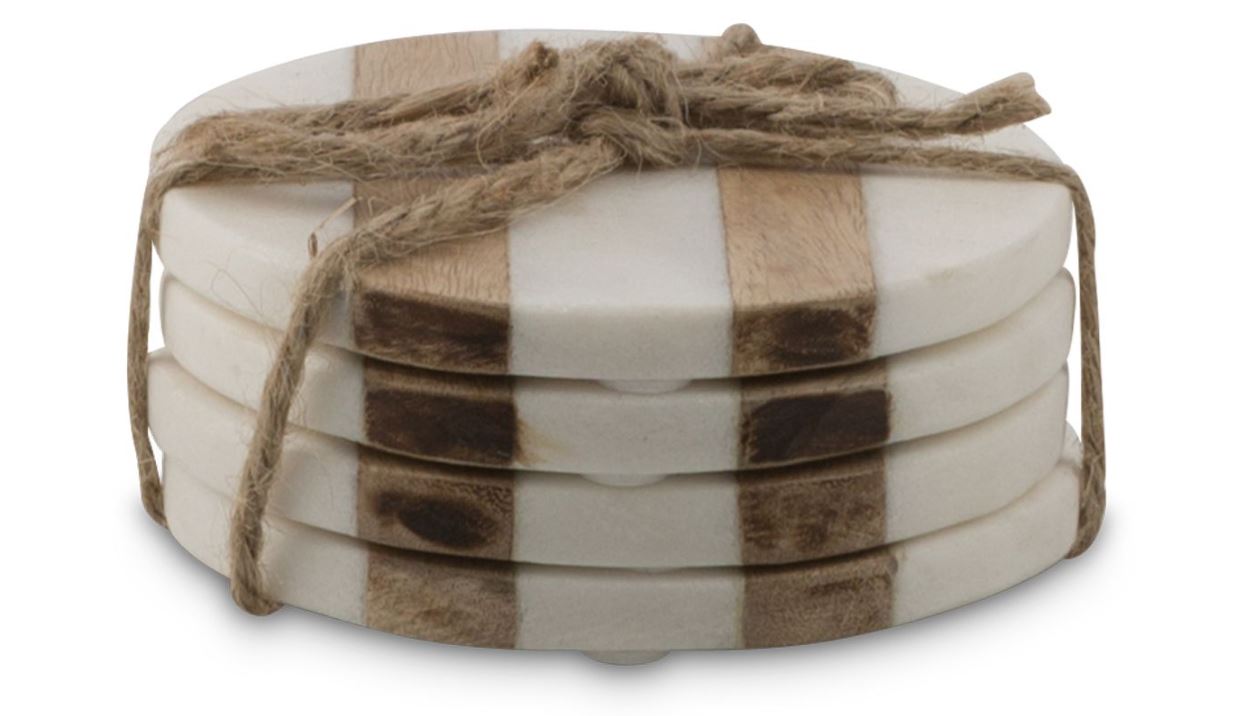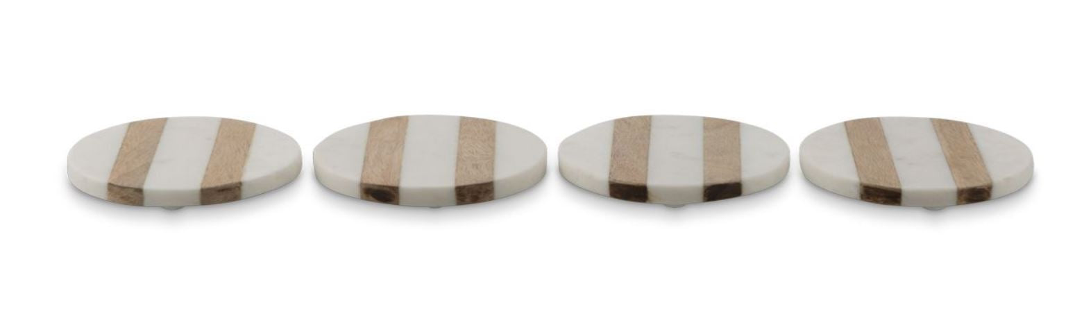 Set of 4 Striped Round Wood and Marble Coaster Set