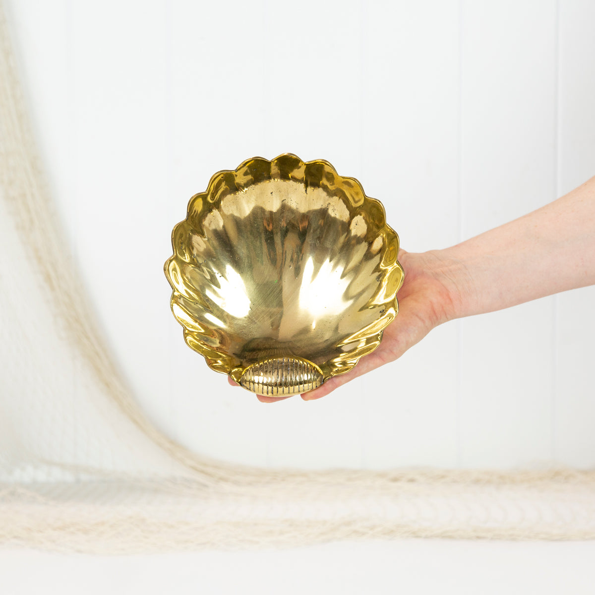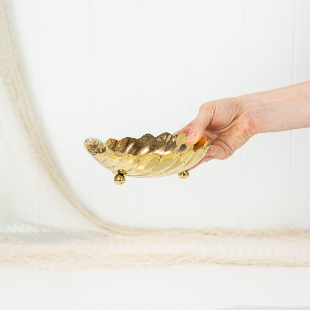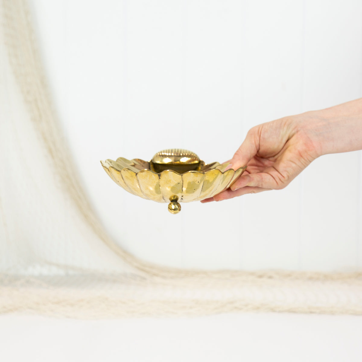 This sweet brass dish is shaped like a scallop shell.