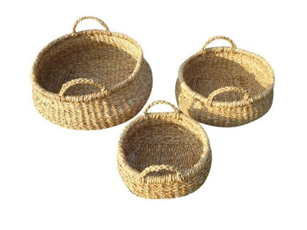 Set of 3 Seagrass Small Round Deck Baskets with Handles.