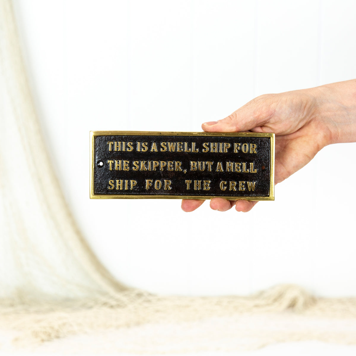It reads 'This is a swell ship for the skipper but a hell ship for the crew.'