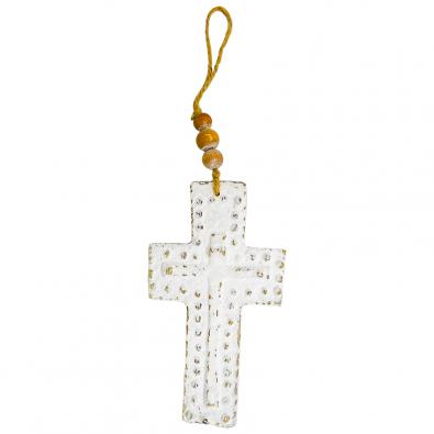 Small wooden cross decor with a vintage white finish. Can be styled on a wall or table top